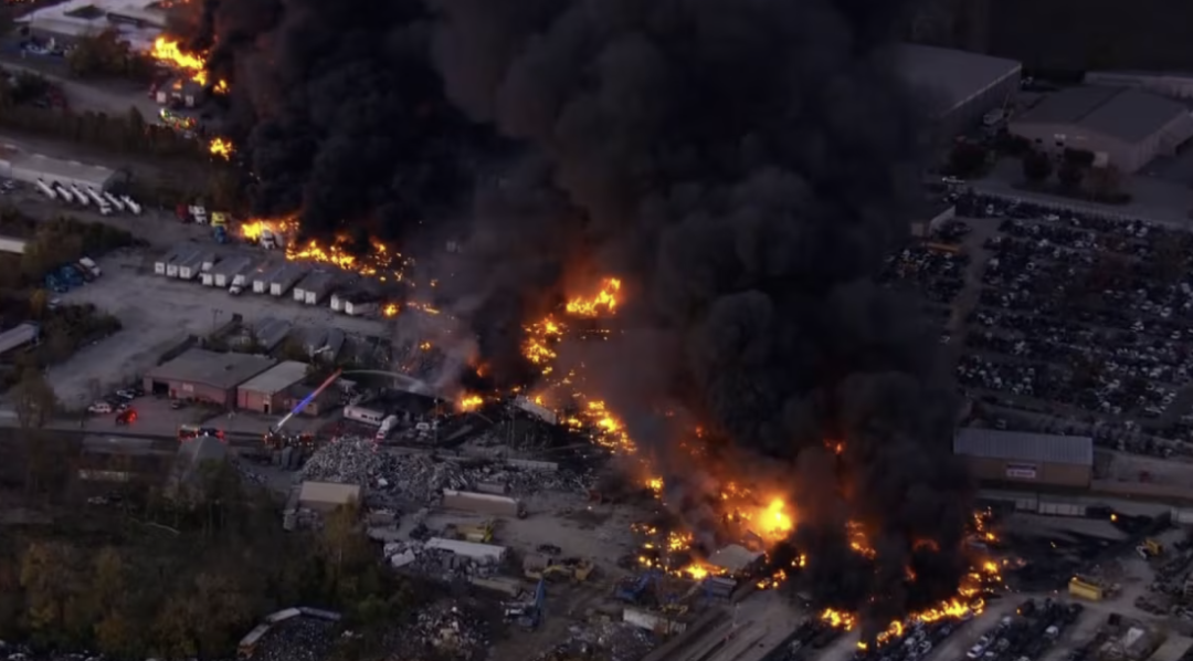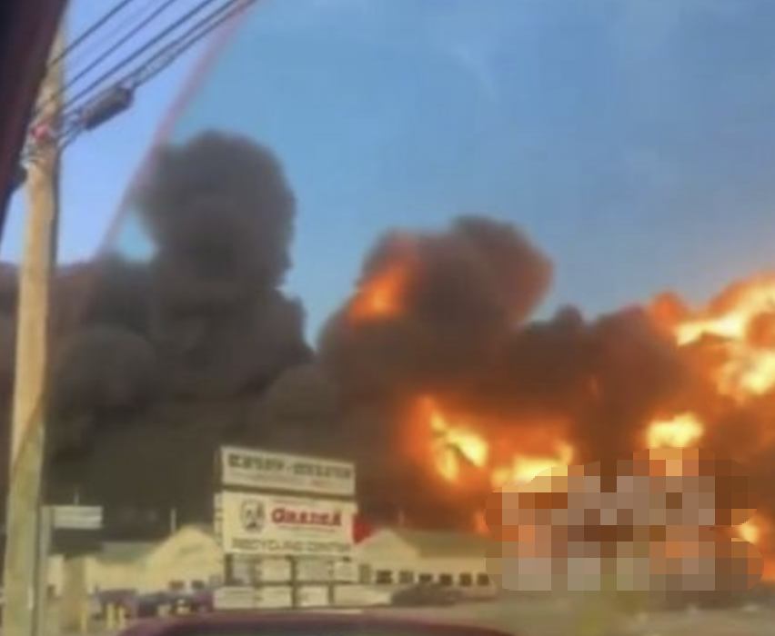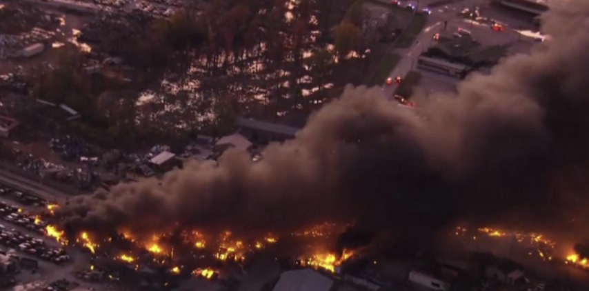 现场画面显示,坠机地点位于机场北侧不到一英里的工业区。一个汽车回收厂和卡车停放场之间,成片的建筑与车辆燃烧成海,烈焰腾起数十米高!