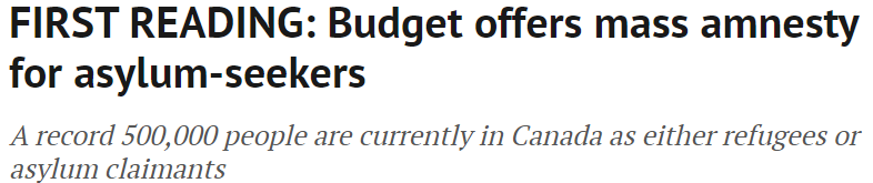作为加拿大联邦预算中“控制移民数量”承诺的一部分,该预算宣布将对近年来进入加拿大的数十万寻求庇护者(其中包括非法穿越美国边境者)实施一次性大规模赦免。