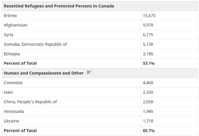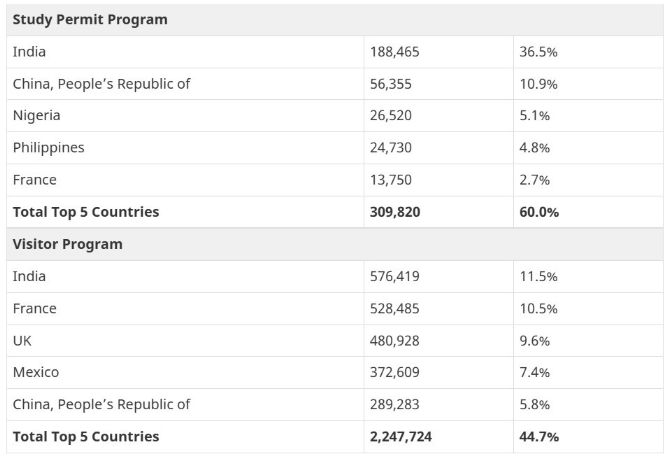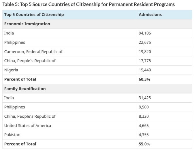 2024年加拿大永久居民的5大来源国: