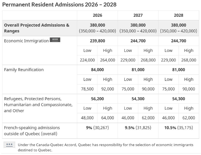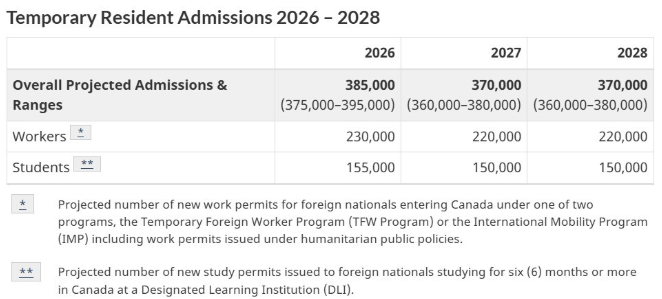 这份移民蓝图显示,加拿大将大幅削减临时居民(包括留学生)的入境人数,从2025年的67万3,650人降至2026年的38万5,000人,并在2027与2028年进一步降至每年37万人。