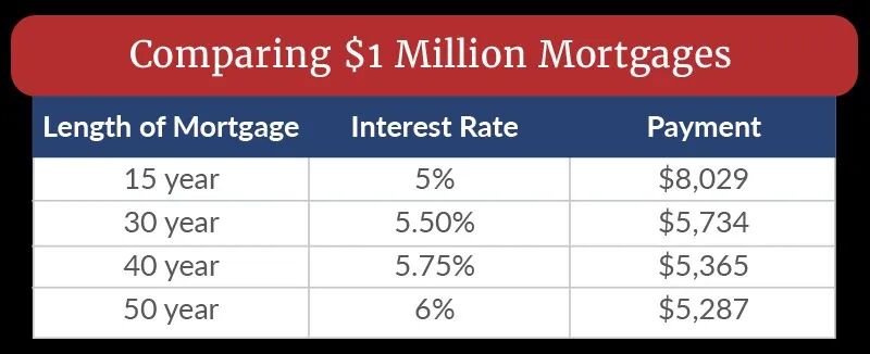 这其实很容易理解。假设15年期固定利率抵押贷款的利率为5%,30年期利率为5.5%,40年期利率为5.75%,50年期利率为6%。那么,同样是100万美元的抵押贷款,如果30年贷款,每个月要支付5734美元,如果是50年贷款,每个月支付5287美元,减少了近500美元。