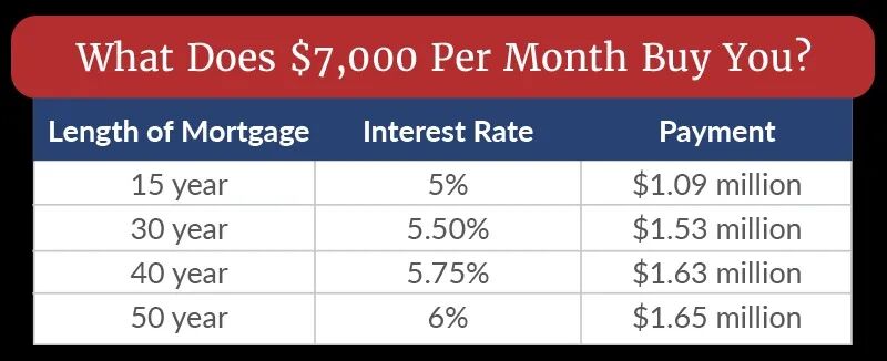 反过来推算,你会发现,如果选择更长的贷款期限,同样的首付,就能买到更贵的房子。假设某人首付20%,每月有7000美元用于偿还本金和利息。那么,他能买到多贵的房子?