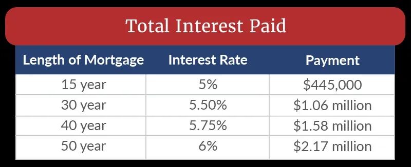 如上图所见,同样是100万美元的房贷,如果选择30年,那么支付的利息总额为106万美元,可是如果选择50年房贷,那么支付的利息总额将是217万美元,整整高出了一倍还多。