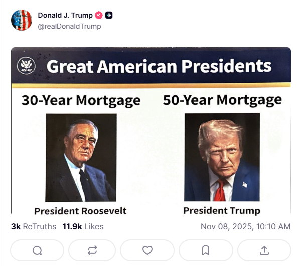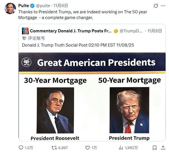 很快,联邦住房金融局(FHFA)局长比尔·普尔特(Bill Pulte)就在社交媒体X转发了川普的截图,并说:“感谢川普总统,我们确实正在努力实现50年抵押贷款——这将彻底改变游戏规则。”