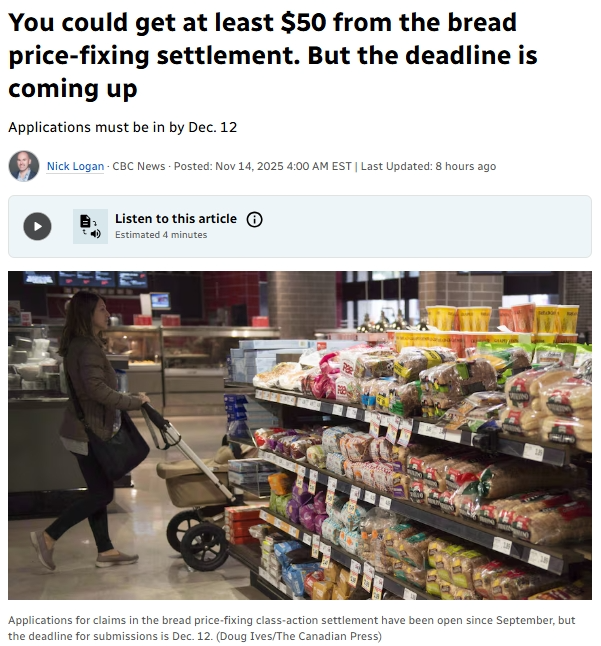 据CBC报道,因加拿大多年涉及包装面包的价格操纵行为,一项价值 5 亿加元的集体诉讼和解金现已进入最后申请阶段。