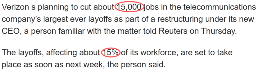 现在,很多大型企业通过大规模裁员来迅速削减成本,例如之前的亚马逊、Meta、微软,还有现在的Verizon。