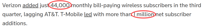 在第三季度,Verizon仅增加了44,000名每月付费的无线用户,远落后于AT&T。而T-Mobile则以超过100万的净用户增长遥遥领先。