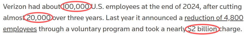 根据Verizon公司年度报告,截至2024年底,该公司在美国的员工总数约为100,000人。过去三年,公司已裁减了约20,000个岗位。去年,公司通过自愿离职计划减少了4,800名员工,遣散费接近20亿美元。