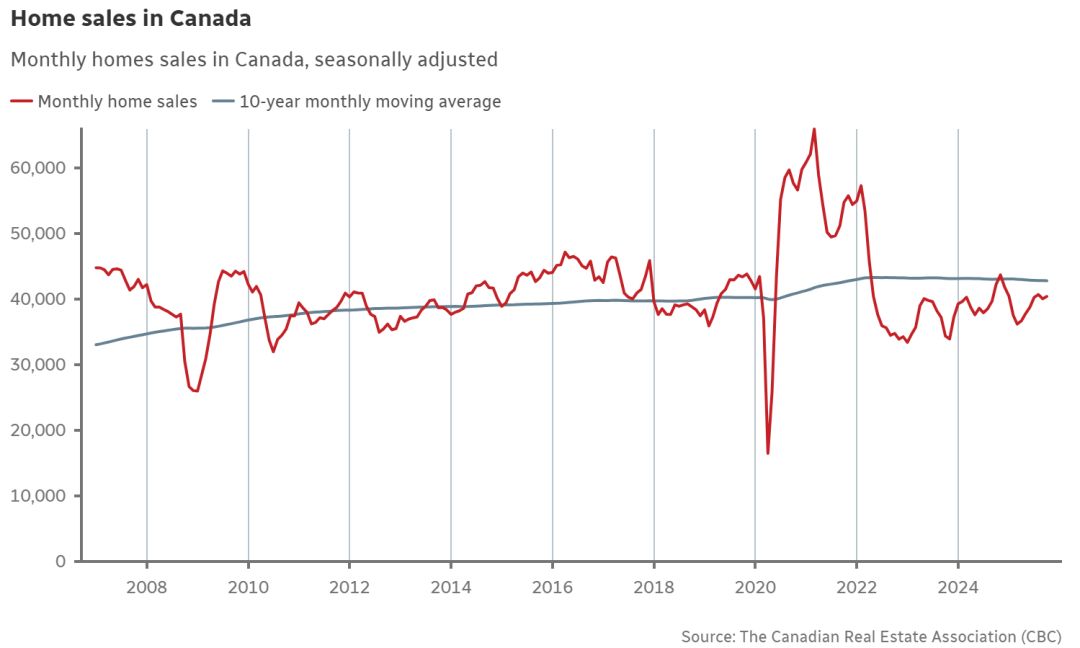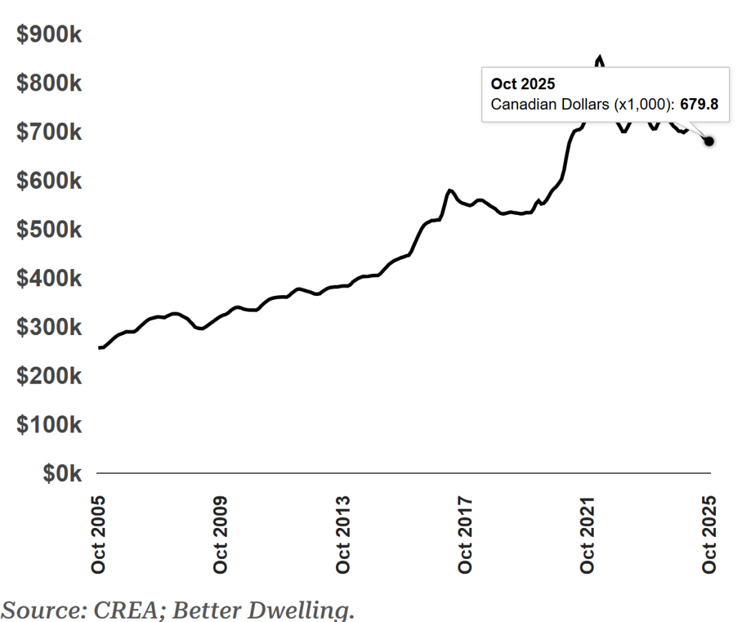 加拿大楼市的低迷正在全面加深。房价跌到四年来最低、库存飙破纪录、买家却依旧不愿出手——这一连串信号,将全国地产市场重新拉回寒冬。 10月份,加拿大房地产协会(CREA)的最新数据显示,全国典型住房价格跌至679,900加元,比去年同期少了21,000加元。 这价格较2022年3月的市场高峰,更是暴跌了20.2%,下降了171,700加元。 这样的价位上一次出现还是在2021年春天。疫情期间的涨幅基本被“抹平”,但房价依然让可负担性紧绷到极限。 销量方面同样不容乐观。10月全国共完成42,068笔住宅交易,比去年下降4.3%,比疫情前的2019年还低6.1%。 按CREA的说法,即使把疫情的特殊波动剔除掉,今年10月依旧是一个异常冷清的月份。 不过,月度数据却呈现另一种“表面回暖”。10月的销量相比上个月上涨了0.9%,是过去七个月里第六次上涨。这说明市场并非完全停摆,而是在缓慢适应利率下降后的新环境。 CREA高级经济学家肖恩·卡思卡特(Shaun Cathcart)指出,自4月以来,全国交易基本呈增加趋势,9月只是短暂暂停。“利率如今几乎到了具有刺激性的区间,预计未来市场活跃度会继续增加,但经济不确定性依然会给复苏套上‘刹车’。” TD银行经济师里希·桑德希(Rishi Sondhi)也持同样观点。他认为“复苏的叙事仍然成立”,但销量水平本身太低,距离“强劲复苏”还差得远。随着积压需求逐渐释放、就业市场明年略有改善,销量有望继续向上走。 然而,销量疲弱的另一面,是卖家前所未有的活跃。 10月份全国新增挂牌达到79,225套,比去年多了4.3%,并刷新同月历史纪录。这不是“小幅增长”,而是异常旺盛的卖盘供应,尤其是多伦多的库存大幅上升,带动全国趋势提前显现。 CREA提醒,小城市也可能会在未来几年跟上这股浪潮。 大量卖盘与疲弱的需求叠加,使10月的“销售—新挂牌比”(SNLR)降至53%,为2012年以来同期最低。历史数据显示,10月份的SNLR只要低于55%,房价就肯定涨不起来,今年也是一样。 各地之间的表现差异依旧明显。BC省和安省的市场对买家更友好,因此价格涨幅更受压制;而在供应紧张的地区,价格虽未大涨,但仍相对坚挺。 CREA统计显示,全国MLS房价指数在10月环比只涨0.2%,而全国平均价格同比下降1.1%。 至于库存,全国共有约189,000套房源待售,比去年大增7.2%。买家在观望、卖家在蜂拥入场,形成了当下市场最鲜明的特征。 尽管借贷成本有所下降、部分买家激励重新推出,但整体可负担性仍处于几十年来的低点,多家银行都警告,这轮修正可能会持续多年。 房价从高峰回落,但相比十年前仍高出25%以上,这让不少潜在买家依旧难以承受。 CREA认为,目前市场属于“缓慢复苏而非快速反弹”。未来几个月将继续在利率、就业及供应变化的综合作用下逐步稳定,真正的更明显复苏或许要等到2026年。 在高房价、贷款压力和经济不确定性的夹击之下,加拿大房地产市场正处于一个漫长的调整期。房子不是卖不掉,而是买家开始精打细算;市场不是没有活力,而是正在寻找新的平衡点。