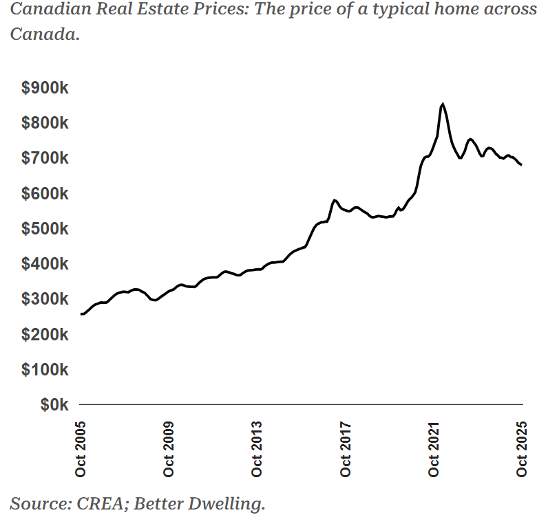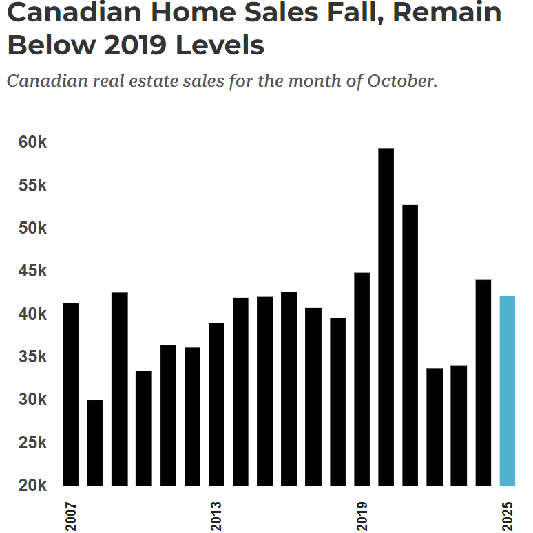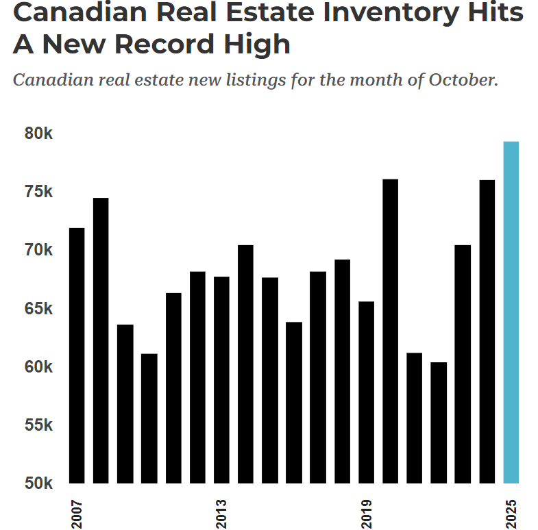 就目前来说,加拿大房地产市场仍处于低迷状态,不过在上个月,一波前所未有的卖方活跃浪潮涌入市场,遗憾的是,买家依旧不为所动。 加拿大房地产协会(CREA)的数据显示,10月份典型房屋的价格已经降至多年来的最低点。 尽管利率下降且买家激励措施增加,但销量仍低于预期,扭转了去年朝着复苏方向取得的进展。 与此同时,新挂牌房源创下历史新高,库存充斥着市场。 上个月,加拿大房地产价格继续下跌。 10月份,典型房屋的价格下降了0.4%(-2,700加元),降至679,900加元,较去年下降了3%(-21,000加元),较2022年3月的峰值下降了20.2%(-171,700加元)。 也就是说,目前房价正处于4年来的最低点,上一次出现这一情况是在2021年3月。 现在的情况是,疫情期间的大部分价格上涨趋势都已逆转,尽管房价仍处于高位,住房负担能力仍面临压力。 加拿大房地产销售量下降,也抵消了去年取得的成果。 10月份的销售量为42,068套,较2024年下降4.3%,较2020年同月的纪录低29.1%。 成交量不仅低于峰值,而且处于历史低位,比2019年疫情前的基准水平低6.1%。 即便按照疫情前的标准来看,10月份对于购房者来说也是个平静的月份。 也许买家可能正在休整,但上个月卖家却表现得十分活跃。 10月份新增房源数量为79,225套,较去年增长4.3%,创下了该月的纪录。 新增房源数量不仅高,而且可以说是异常高,但这并不令人意外。 本月早些时候,多伦多房地产委员会报告称库存大幅增加,而作为加拿大最大的市场,它也算是引领了这一趋势。 加拿大皇家银行助理首席经济学家Robert Hogue表示,市场上的库存量已经持续增长了两年,尤其是在安大略省和BC省,今年春季这些地区的待售房屋数量达到了数十年来的最高水平。 房源数量的激增以及销售量的减少使得10月份的销售与新增房源比率(SNLR)降至53%,这是自2012年以来该月的最低水平,且比去年低了5个百分点。 通常情况下,这会表明市场处于平衡状态,价格变动不大,但在全国范围内,10月的情况却很少如此。 2022年,SNLR为56%时,仍造成了有记录以来第二大的月度价格跌幅。 历史上,10月份从未出现过SNLR低于55%且价格仍呈增长态势的情况。 虽说加拿大房价仍在下跌,但还是比十年前的起点高出25.6%。 尽管融资条件有所放宽,且买家激励措施增多,但销售量仍在持续下降,库存仍处于较高水平。 由于高利率以及就业前景的不确定性,所以买家一直持观望态度,与此同时,美国总统特朗普实施的关税举措也对经济造成了冲击。 阿尔伯塔中心的首席经济学家Charles St-Arnaud说道:“鉴于不确定性预计仍将居高不下,未来几个月房地产市场的任何好转都可能幅度不大。 房地产市场面临的主要风险依然是劳动力市场的恶化,这将导致大量工作岗位的流失。” 不过需要注意的是,全国性的数据并不能全面反映加拿大房地产市场的全貌。 Robert表示,在安大略省和BC省之外,该国的一些地区仍然对卖家非常友好。 魁北克的热度尤其高,在10月份,魁北克市的房价上涨了17.5%,这是该国所监测地区中涨幅最大的一次。 曼省、新不伦瑞克省、新斯科舍省以及纽芬兰和拉布拉多省也正面临供应紧张和需求稳定的局面,这使得房价进一步上涨。 卡尔加里曾是加拿大最热门的房地产市场,但不久前已明显降温,10月份的房屋销售量下降了12%,房价也下降了2%。 至于安大略省和BC省,现在仍处于脆弱状态。 MortgageLogic.news的策略师Robert McLister说道:“在像多伦多、温莎、圭尔夫等存在地区性风险的市场中,下跌趋势十分强劲。 短期的反弹并不意味着已经触底。”