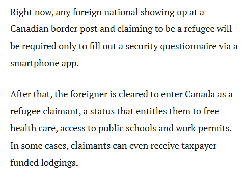 目前,任何外国公民只要在加拿大边境口岸声称自己是难民,只需通过手机App填写一份安全问卷(勾选几个选项),就能直接以“难民申请人”身份进入加拿大。