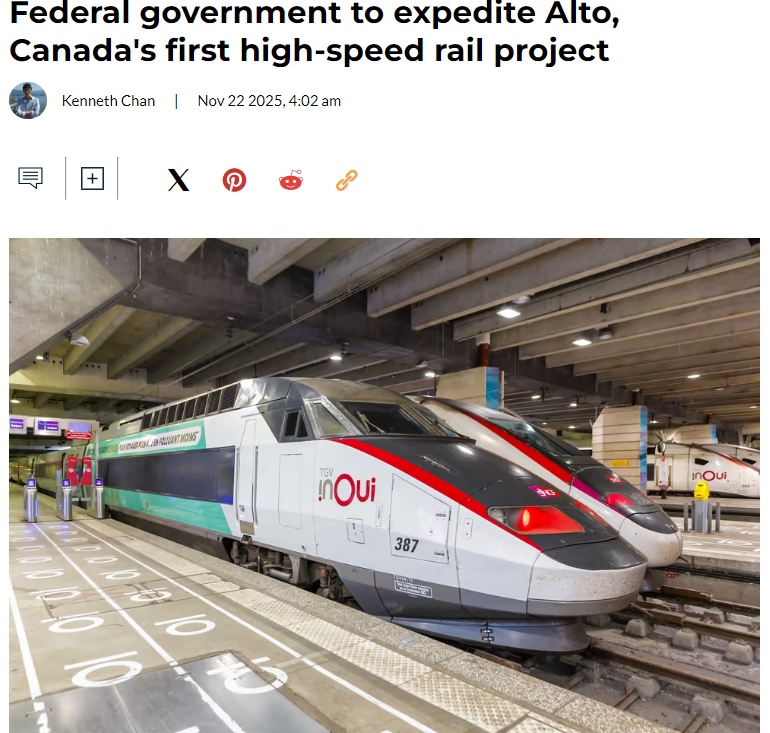 作为加拿大历史上规模最大、投资最昂贵的交通基础设施建设项目之一,国家首条高速铁路项目Alto有望提前开始建设。 本月早些时候,加拿大总理卡尼在2025年预算中提出,联邦政府强调Alto的工程、监管和审批工作将加快进行。 这将使Alto项目的建设能够在4年内启动,最早可能在2029年开始,而不是原计划的8年时间。 正如2025年初联邦政府所宣布的那样,当时联邦政府宣布选定一家私营财团来领导该项目,并决定将该项目从高频铁路(HFR)标准升级为更为先进的高速铁路(HSR)模式。 Alto项目将覆盖从多伦多到魁北克市约1,000公里的路程,沿途设有重要站点,提供的客运铁路服务将比现有的VIA铁路运营更快、更频繁、更可靠。 2025年11月的预算指出,Alto项目的加速进展将得到联邦政府新设立的重大项目办公室(MPO)的支持,该办公室旨在减少繁文缛节、优先考虑并快速推进具有重大经济和/或国家安全价值的“国家建设项目”,例如自然资源项目、能源和交通基础设施项目。 在2025年9月MPO及其首批项目公布时,便提到了Alto项目,但当时并未将其纳入该办公室的项目范畴内。 此外,该预算指出,Alto项目将得到后续立法修正案的支持,以简化审批流程并减少监管不确定性,由此可见政府的重视。 该措施预计不会对特定群体产生显著直接影响,当地居民社区及其他代表性不足的群体正被邀请参与Alto高速铁路项目的规划工作,并帮助他们提升参与项目设计和建设的能力和准备程度。 一旦项目完工,将通过提供更快、更可靠的客运铁路服务,直接惠及魁北克市至多伦多沿线的旅客。 预算文件中这样写道:“这些旅客更有可能是学生、高学历人士以及中等收入家庭。” 在规划的这一初步阶段,尚无具体的建设成本估算,但肯定会在数十亿加元的范围内。 其成本很可能会比原高速铁路概念的初步估算高出数倍,即超过此前的60亿至120亿加元。 仅就修建高速铁路所需的大量技术设计、工程以及规划工作而言,联邦政府已经预留了39亿加元,即便在开工之前就已经做好了这笔预算安排。 联邦政府预计,Alto项目的建设将创造51,000个工作岗位,并为国内生产总值贡献高达350亿加元。 2025年2月,在经过漫长的采购流程后,联邦政府选定了一个名为Cadence财团的私营联合体来负责Alto项目的规划、设计、建造、运营、维护以及资金支持工作。 Cadence是一家合资企业,其成员包括法国政府所属的法国高速铁路运营公司“SNCF Voyageurs”、法国交通工程公司“SYSTRA”,以及加拿大机构投资者La Caisse、加拿大工程公司AtkinsRealis以及加拿大航空公司。 La Caisse与AtkinsRealis还参与了温哥华SkyTrain Canada Line和蒙特利尔新“REM”地铁网络的公私合作项目。 此外,联邦政府还新成立了一家名为Alto的国有公司(与维亚铁路公司互不关联),负责监督该项目以及Cadence公司的各项活动。 目前Alto项目的设计方案和具体路线尚未确定,但除了多伦多和魁北克市的终点站之外,其规划还包括在彼得堡、渥太华、蒙特利尔、拉瓦勒和Trois-Rivières等地修建车站。 目标是让Alto的时速达到300公里/小时或更高,并将该铁路走廊沿线的乘客出行时间缩短一半,蒙特利尔到多伦多仅需3小时。 Alto将由架空接触网供电线路提供动力,并拥有专用轨道,这意味着它不会与货运列车和其他维亚铁路服务共用轨道。 根据VIA Rail 2024年的年度报告,温莎至魁北克市之间的更广泛铁路走廊共运送了约420万名乘客,低于疫情前2019年近480万名乘客的水平。 2024年的数据反映了疫情后的持续恢复过程,以及该铁路走廊沿线的一些运营挑战,这些挑战对服务的准点率产生了重大影响。 对于Alto项目的建设,大部分网友都是不看好,觉得要到猴年马月才能修好。 “计划何时完工?不知道这辈子还能看到吗?” “根本就是个幻想!光环保就难以通过!还记得温哥华输油管道铺设吗?至今完工了多少?” “已经不抱希望了...”