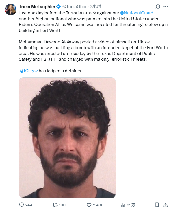 联邦调查局(FBI)与德州公共安全部门逮捕了一名阿富汗籍男子穆罕默德·达乌德·阿洛科扎伊。