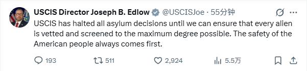 USCIS局长约瑟夫·埃德洛在声明中指出,此举是为了确保所有申请人都能接受“最严格的审查”,并在评估系统安全性后再恢复正常处理程序。