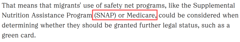 提案中指出,将允许移民官员拒绝向那些使用联邦公共福利,如医保“白卡”(Medicaid)、食品补助(SNAP)以及租房补贴等申请者发放绿卡。