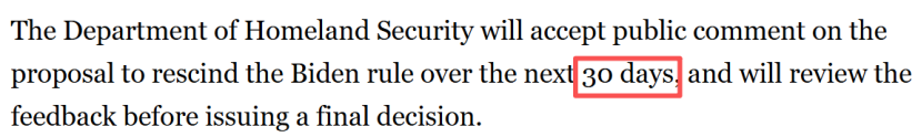 国土安全部(DHS)将就废除拜登政府规则的提案公开征求公众意见,征询期为30天,随后将根据反馈作出最终决定。