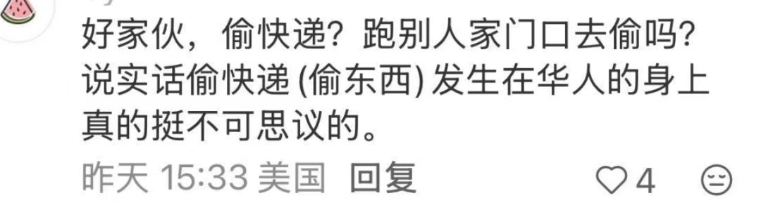 [color=rgba(0, 0, 0, 0.9)]“好家伙,偷快递?跑别人家门口去偷吗?说实话偷快递(偷东西)发生在华人的身上真的挺不可思议的。”