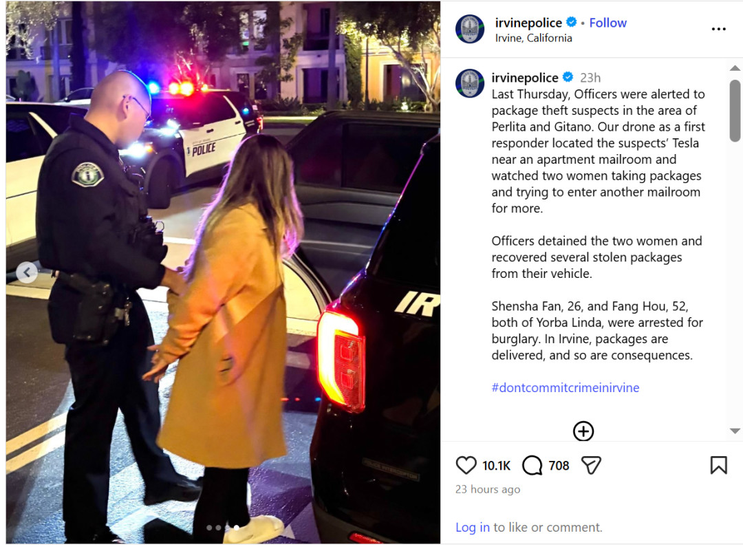 [color=rgba(0, 0, 0, 0.9)]尔湾警方强调,包裹盗窃仍然是严重的犯罪行为,并着重介绍了目前警方可以使用包括无人机在内的科技手段,帮助快速定位嫌疑人。
