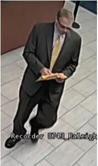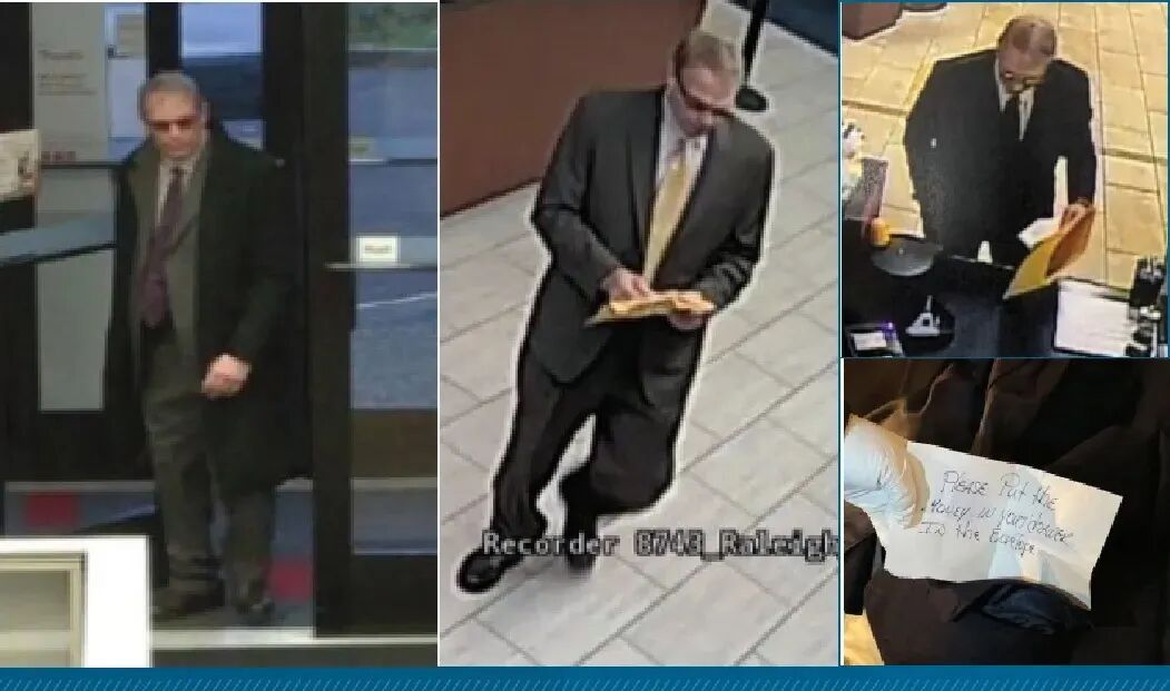 • 12月19日下午,嫌疑人进入附近的大通银行(Chase Bank)。文件显示,他当时身穿蓝色格纹西装、红色领带,向柜员递交写有“将所有钱放入信封”的纸条,并多次表示“抱歉”,称他人即将到达。嫌疑人随后携款离开。