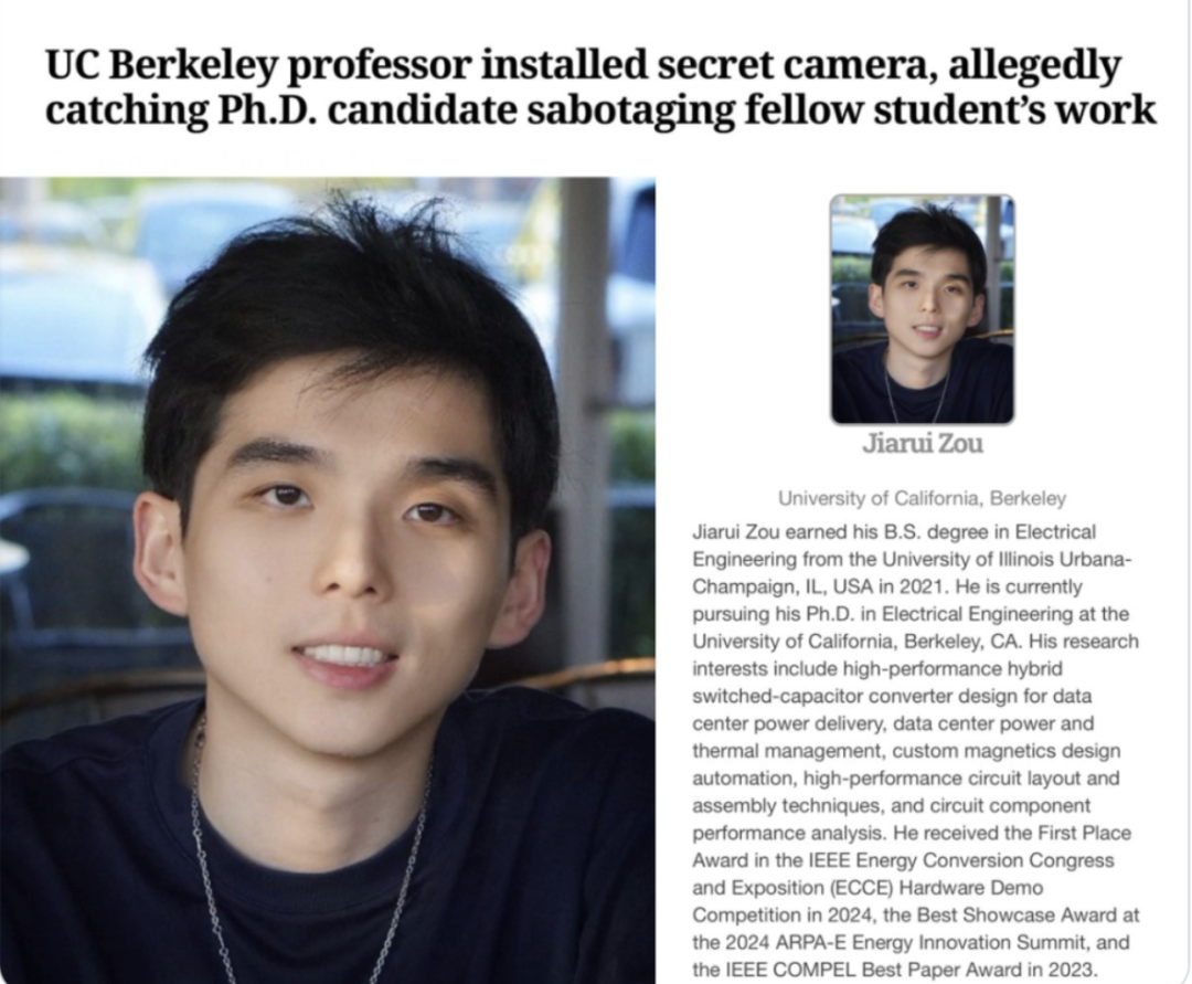 人心深不可测,世界上这么多千奇百怪的案件都证明了这一点。 最近,美国名校的顶尖科研实验室上演了一场令人毛骨悚然的一幕—— 实验室里的设备总是无缘无故地被弄坏、电脑突然报废、精密仪器失灵、实验被迫中断,怪事连连,还持续了2年! 没想到,这一切的背后,竟是一个华人学霸嫉妒心作祟?! 事情发生在加州大学伯克利分校的一个实验室,能进到这里的,都是来自各大名校的顶尖学子,为了科学不断钻研,希望有一天能爬到行业的顶层,闯出一番天地。 然而,从2年前开始,这个实验室就经常发生怪事,设备总是被破坏,一次、两次、十几次,到最后累计损失金额高达 46,855 美元! 最初,所有人都以为这是设备老化、操作失误,或者技术故障。 但时间一长,问题开始变得不对劲。 根据警方文件,一名电机与计算机工程系教授多年来持续收到学生们的投诉,说“设备又坏了、刚修好没多久,而且坏的都是同一位学生的电脑。” 这些设备并非普通办公电脑,而是高度定制、价格昂贵的科研硬件,直接关系到实验数据、论文进度和毕业时间。 教授逐渐意识到,这不是偶然或巧合,而是实验室出“内鬼”了! 在获得大楼管理员许可后,教授偷偷在实验室里放了一台隐藏摄像头。 他设计的很巧妙,就安在公用电脑上,镜头正对着频繁出问题的设备区域。 没过多久,关键画面出现了——一名学生走近同实验室另一位博士生的电脑,用不明工具敲击!下一秒,火花四溅! 而画面中的人,正是实验室的华人准博士邹家睿(Jiarui Zou,音译)。 人赃俱获,当地警方立即介入。 11月12日,他们在校内将26岁的邹家睿当场逮捕,指控他在11月9日与10日两天内,涉嫌三次恶意破坏实验室设备,每次损毁金额超过400美元,这已经符合加州重罪标准。 被捕后,邹家睿拒绝向警方提供陈述证词,但目前已获释,首次出庭提审时间为12月15日。 虽然目前检方正式指控的,仅限于这三次被录像清晰捕捉到的破坏行为,但事情远不止如此。 教授与多名受害学生向警方表示,他们怀疑类似的破坏行为已持续了至少两年。 根据调查材料,就这一个学生的个人电脑损失至少2,119美元,实验室整体设备累计损失约46,855美元,但由于早期缺乏直接证据,之前始终无法立案。 根据校方公开信息,这个实验室从事的是可重构电容转换器、高效率混合电力转换器、多层级电力电子系统和电源管理集成电路,高度依赖精密硬件与实验。 设备被毁,不仅意味着金钱损失,更可能导致实验数据无法复现、论文延期甚至作废、项目中断,大家毕业时间被迫延后。 对部分国际学生而言,科研延误甚至可能影响在美身份。 问题是,邹家睿也是个标准的“别人家的孩子”,他的履历简直金光闪闪。 邹家睿本科毕业于顶尖名校伊利诺伊大学香槟分校(UIUC),2021年取得电气工程学士学位后,就踏入了加州大学伯克利分校的大门,攻读电气工程博士学位。 邹家睿的研究领域极其前沿,深耕于数据中心电源传输、高性能电路布局以及混合开关电容转换器设计等高精尖方向。 这两年,他还在学术圈混得风生水起,荣誉等身。仅2024一年,他就接连斩获了两项重量级大奖。 一个在领奖台上享受掌声的“天之骄子”和顶尖工程师,却在道德的考卷上交出了零分的答卷。 截至目前,校方尚未发布进一步公开声明。 不少吃瓜的伯克利学生也在社交媒体上感叹:“这简直是技术大牛的内斗,剧情比写论文还烧脑!” Pilawa实验室的研究项目,无论是“定制测试台”还是“电力电子设备”,都是高价值的科研资产。但在邹嘉瑞的手中,这些人类智慧的结晶,竟成了他发泄私愤、排挤同门的牺牲品。 这一案件也引起不少网友议论纷纷:“科研环境最怕的不是竞争,而是这种人,自己不行,也不让别人行。”