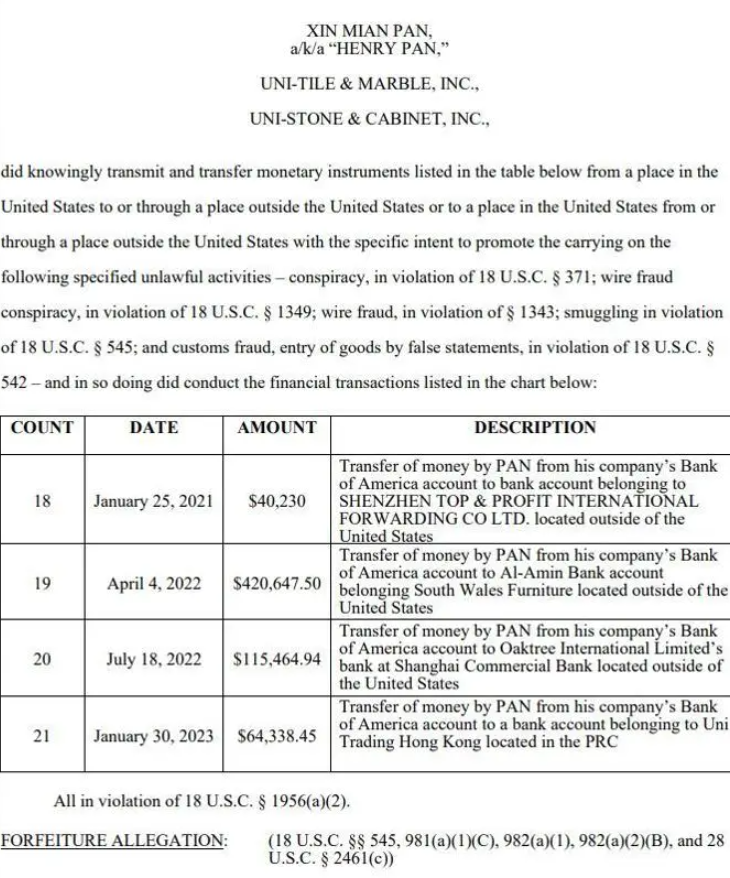 陶瓷磁砖合并税率最高达689.50%。 起诉书指出,自2018年9月至2023年8月期间,被告策划并实施规避上述合并税率及其他海关税的计划,以提高相关公司的利润,并使个人从中获利。潘信勉名下公司进口的石英台面、木制橱柜及陶瓷磁砖,均属于依法应适用合并税率的商品。 检方称,潘信勉与王进华及其物流公司,将中国制造的货物先运送至马来西亚,再由马来西亚出口至美国奥克兰港,并在向CBP申报时,虚假宣称货物产自马来西亚。 此外,起诉书还指出,被告利用空壳公司,在进口文件中虚假登记美国境内的进口商与收货人,而货物的实际最终去向,仍是潘信勉所拥有的友利瓷砖云石与友利石材橱柜公司。同时,被告还被指控对商品进行不实分类,并向海关提交虚假文件。 检方举例说明,其中一次货运中,友利瓷砖云石公司进口超过15万公斤的磁砖,因申报为马来西亚制造,仅缴纳约2800美元入境费用;若如实申报为中国制造并直接自中国进口,应缴税款超过22万美元。 整体而言,检方指称在相关期间内,被告及其共谋者共进口约520批货物,使相关公司逃避向美国政府缴纳超过1亿900万美元的关税。美国海关亦因此对友利瓷砖云石公司及潘信勉个人(以连带责任方式)发出约2亿2250万美元的预处罚通知。 根据检方说明,若潘信勉最终被定罪,最高可面临20年监禁。 检方在起诉书中同时解释,美国对特定外国进口商品征收反倾销税与反补贴税,目的在于防止外国商品因低于公平市场价格销售,或因政府补贴而获得不公平竞争优势,从而对美国本土产业造成实质损害。当反倾销税与反补贴税同时适用于同一商品时,其合计税率即被称为“合并税率”。 该案目前仍在司法程序中,相关指控尚待法院裁决。