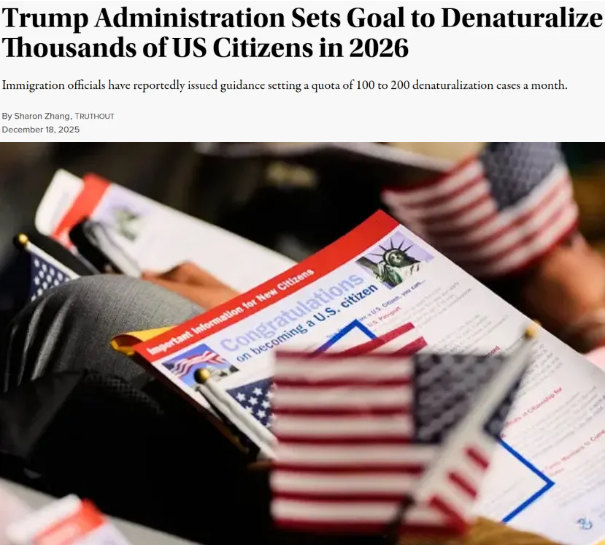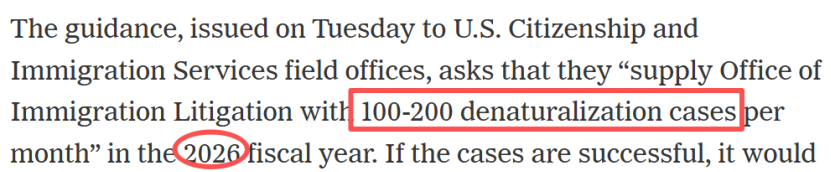 根据《纽约时报》(The New York Times)报道,特朗普政府最新内部指导方针要求,USCIS自2026年起,每月向移民诉讼办公室提交约100至200起国籍撤销案件,全年目标超过1000起。