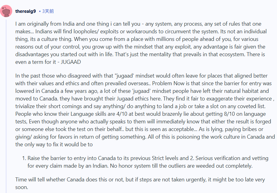 这位网友认为,加拿大此前降低移民门槛后,大量带着这种“jugaad”思维的人进入加拿大,并把相应的行为方式一并带了进来。