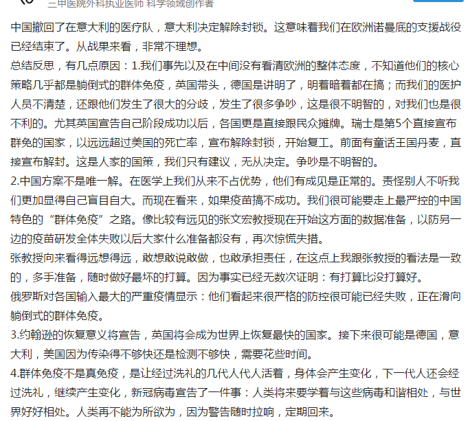 还有标明身份为执业医师的意见人士据此反思说,仿照中国方式的意大利在欧洲宛如异类,抗疫效果也不见佳,中国在不熟悉别国国情的情况下贸然推广经验不明智,群体免疫才是更适合欧美国家的方式。