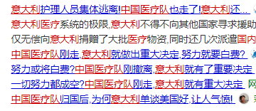 虽然找不到任何官方权威声音证明,中国不准备向意大利提供援助,或者意大利不准备再接受中国援助。但一些劣质公众号百家号,就跟炒作“XX为何渴望回归中国”一样,俄罗斯套娃一般整出一些文章,仿佛意大利不识好歹,中国已前功尽弃。