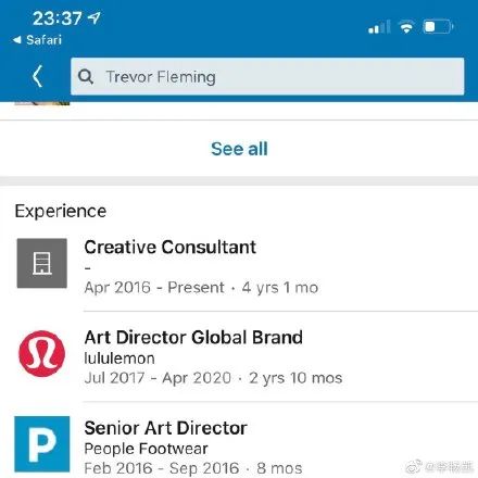 网友还找出lululemon前设计师的领英资料,指出lululemon那段职业背景的资料是新改成4月为止的。