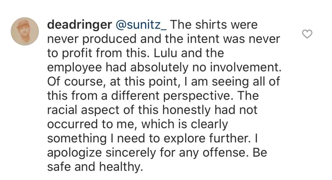 他声明这件服装从来没有被生产,意图也并非从中获利,lululemon的品牌方及职员并不涉及此事。