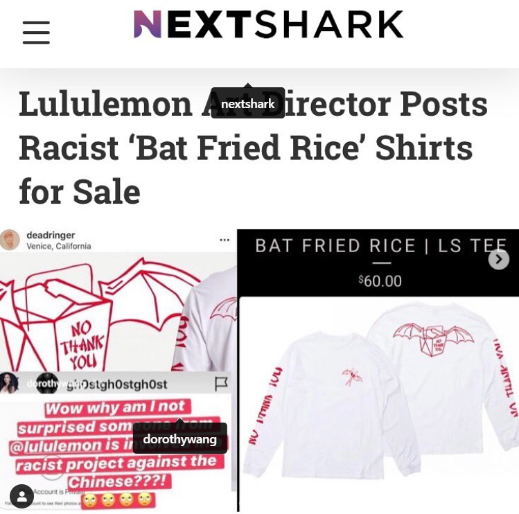 文章标题为《Lululemon艺术总监贴出带有种族歧视色彩的“蝙蝠炒饭”t恤出售》(Lululemon art director posts racist ‘Bat Fried Rice’ shirts for sale)。