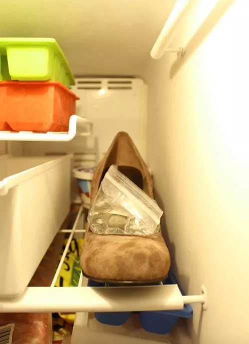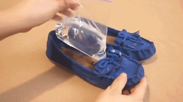 然后把鞋子放在冰箱里,等到水结冰以后会在鞋子里膨胀,拉伸鞋子。最后就可以从冰箱里取出鞋子和袋子,看看鞋子是不是很快变合脚啦?