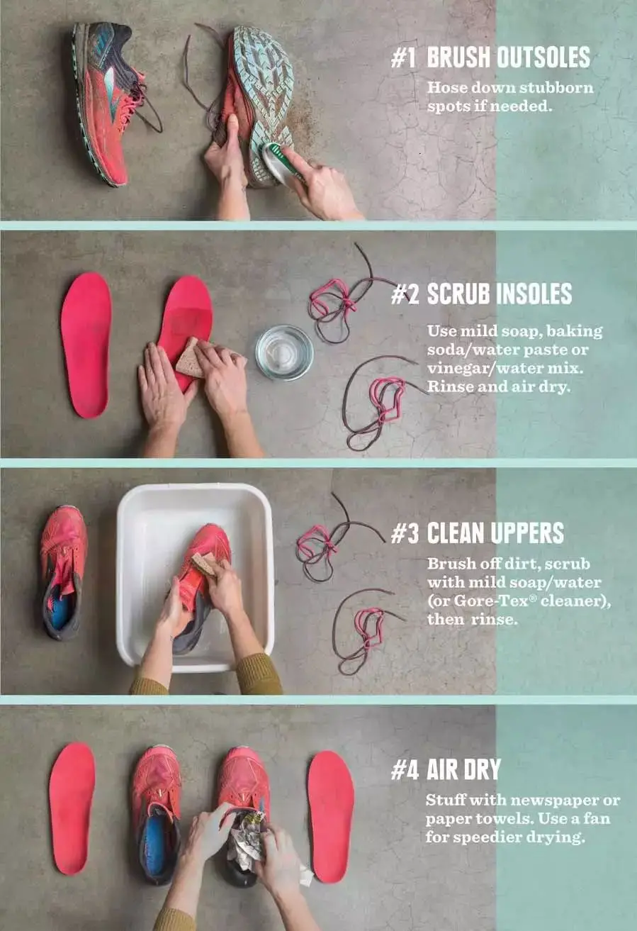 在新鞋上脚之前可以喷一些防水喷雾,保持干燥,防潮又防尘。如果鞋子脏了,清洁起来也不麻烦,用刷子加上肥皂水刷一刷,鞋垫和鞋带也别忘了清洗干净哦。