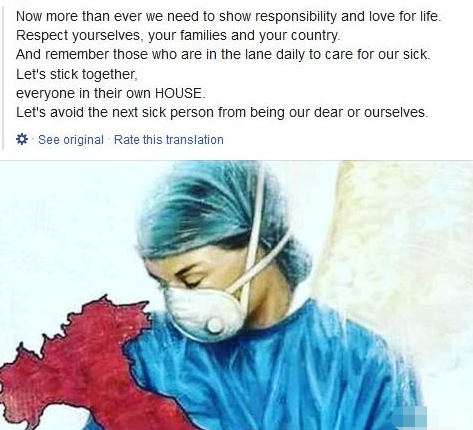 洛里娜去世前几天,还在脸书上发文表达了对意大利在抗疫期间41名医生感染去世的惋惜之情,呼吁人们居家隔离: