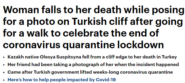 一名哈萨克女网红为了庆祝解封,跑到悬崖上拍美照留念。未料一个失足,从35米高的悬崖坠落身亡。