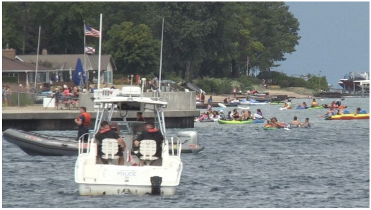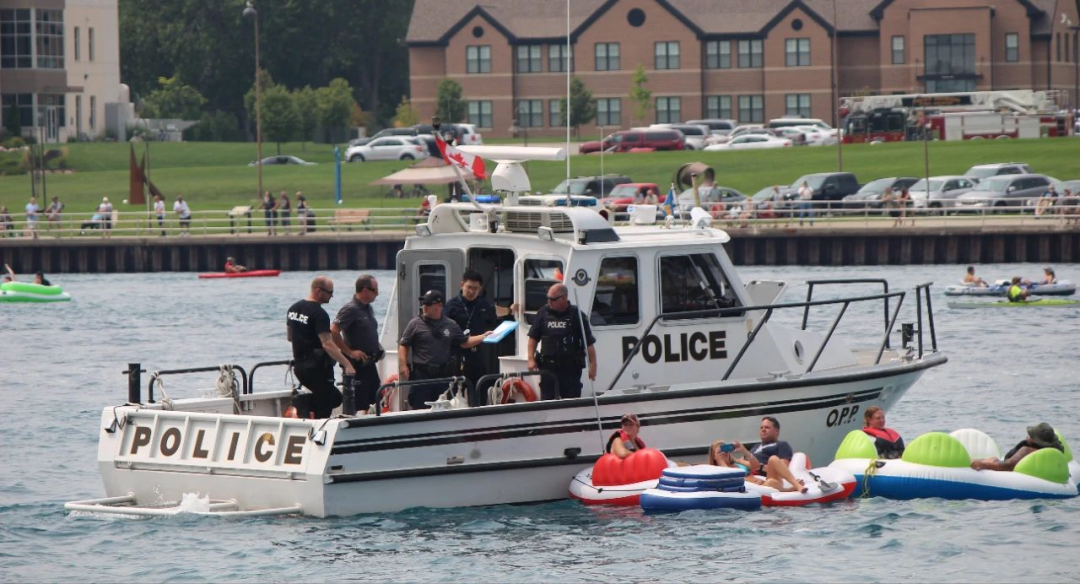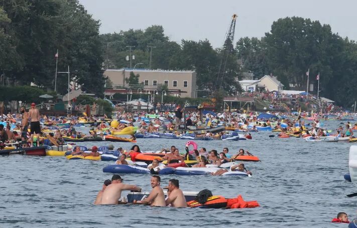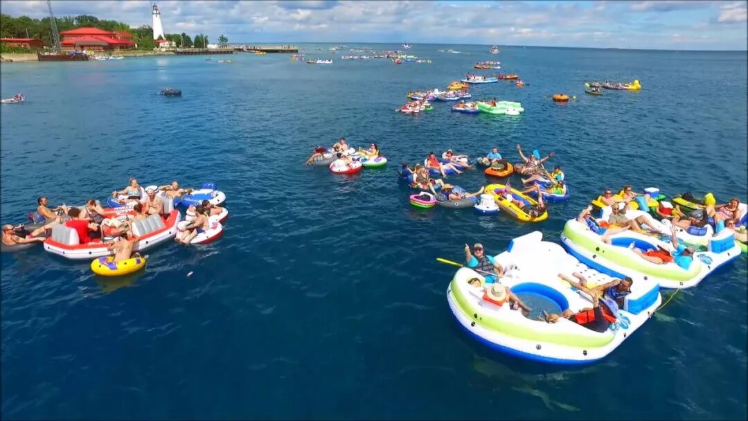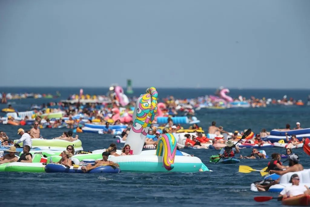 在这个美加边境的狂欢日,有成千上万的美国人乘坐各种船只、漂流筏、甚至充气内胎和充气床垫,从密歇根州的休伦港到圣克莱尔河(St. Clair River)上往下流漂浮12公里。