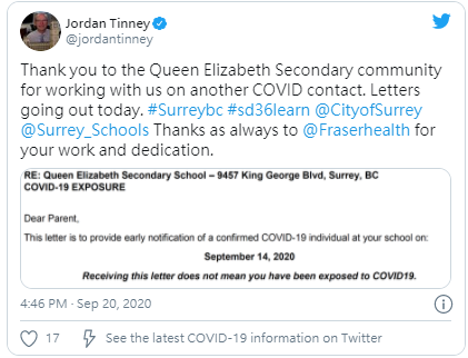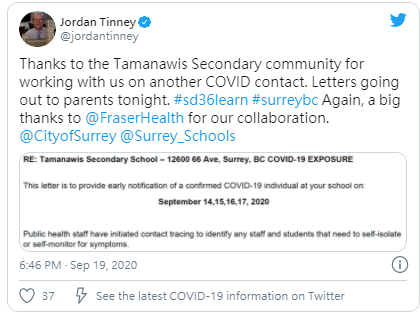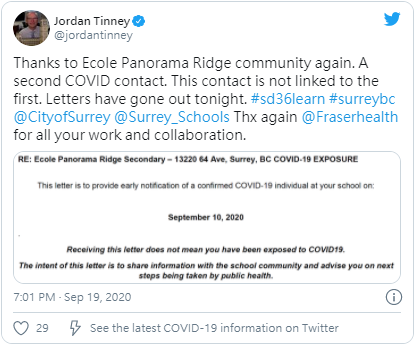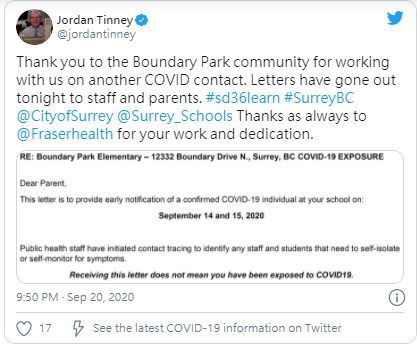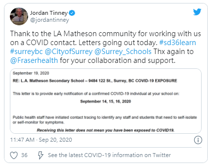本周一(21日)一早,大温疫情重灾区——素里教育局36学区负责人乔丹·廷尼(Jordan Tinney)发布紧急通知——该学区内再有5所学校中招!