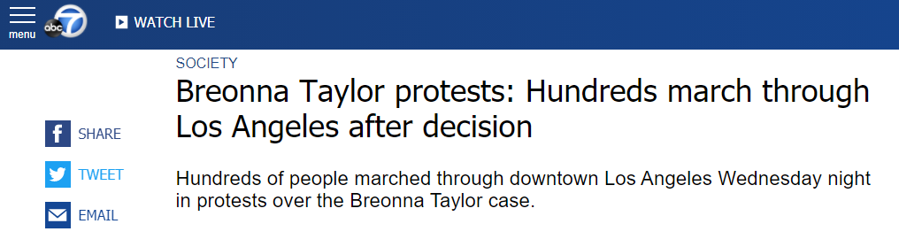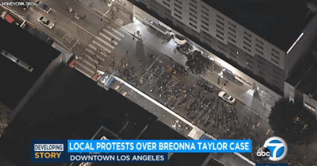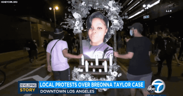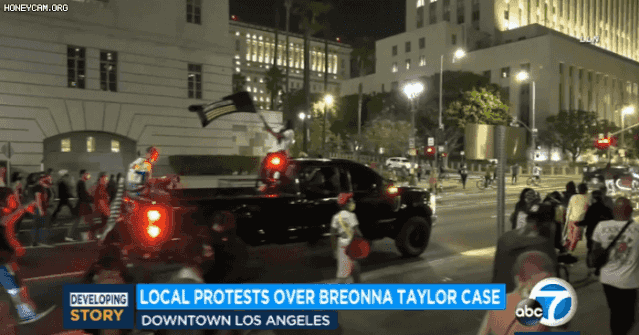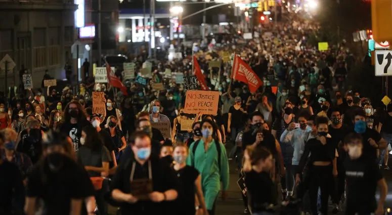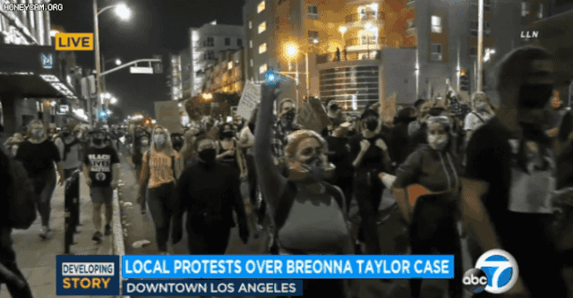 美西时间2020年9月24日,据洛杉矶当地媒体ABC7 News报道,周三晚上,数百人齐聚洛杉矶市中心,在街头举行了一场声势浩大的游行,抗议布伦娜·泰勒(Breonna Taylor )一案的判决。