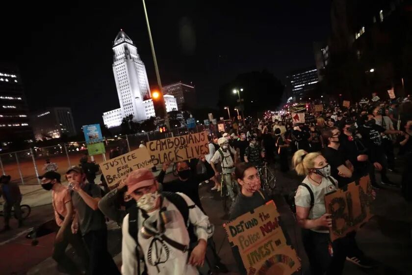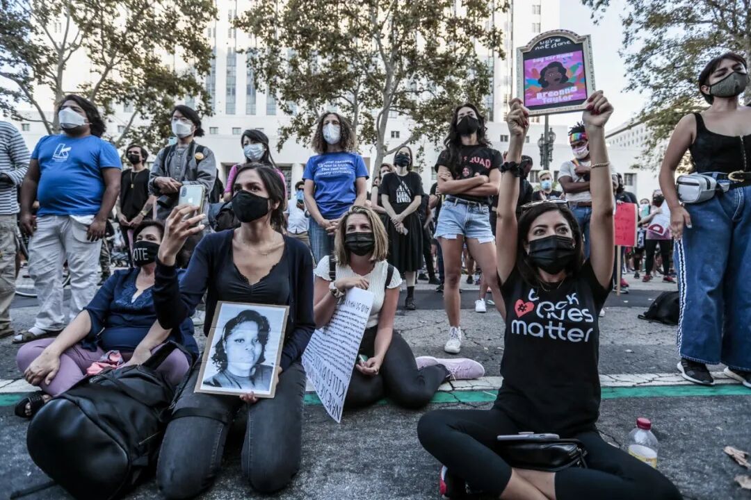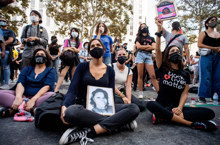 图:游行人群推着受害者布伦娜·泰勒的照片 (来源:洛杉矶时报)