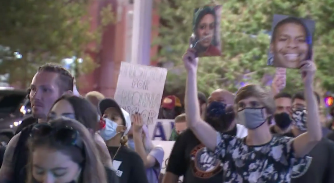 图:游行人群推着受害者布伦娜·泰勒的照片 (来源:ABC7 News)