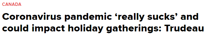 同时,他还指出,加拿大人不仅要在这个万圣节舍弃“不给糖就捣蛋”传统活动,就连两个月后的圣诞节,都可能无法进行家庭聚会。