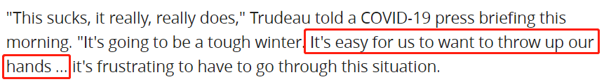同时,特鲁多还提到:“看着你在加拿大另一端的朋友,正在做你想做而不能做的事情,这也很令人沮丧。”