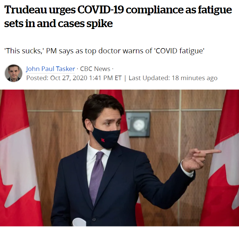 “在全加拿大许多地方,你必须向你的孩子解释,这周末我们不能出去玩trick-or-treat了,我知道这非常令人沮丧。而更令人沮丧的是,除非我们非常、非常小心,否则这个圣诞节,很可能也不会有你想要的像往常那样的家庭聚会了。”