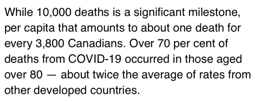 统计局表示,一万这个数字也意味着,每3800个加拿大人就有约一人因为新冠死去。70%的死者在80岁以上,是其它发达国家平均死亡率的两倍。