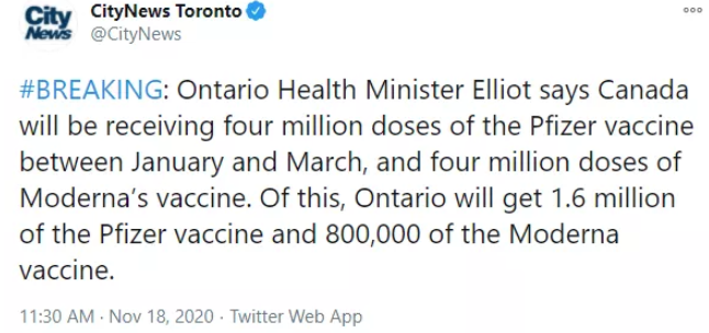 目前,加拿大将会在明年1月至3月间,收到400万支辉瑞疫苗和400万支莫德纳疫苗,共计800万支疫苗。