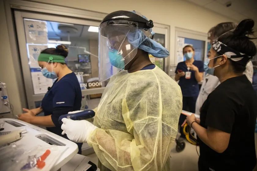 图:ICU内忙碌的医护人员 (来源:洛杉矶时报)