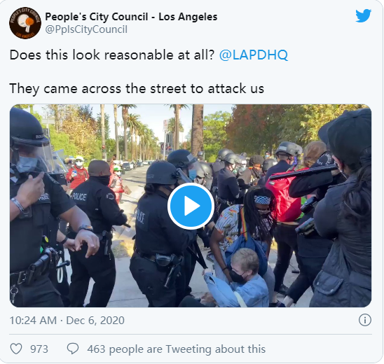 对此,洛杉矶市议员Nithya Raman说:“洛杉矶警察局对和平行使言论自由权的洛杉矶人使用武力是没有正当理由的。”自抗议开始以来,至少有三人被捕。
