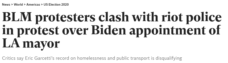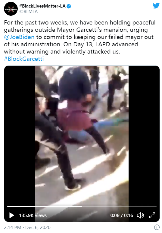 Black Lives Matter-Los Angeles和Ground Game LA誓言要每天举行示威,直到拜登承诺不任命加西堤进入内阁。他们对加西堤处理无家可归、公共交通和其他问题的方式持批评态度。