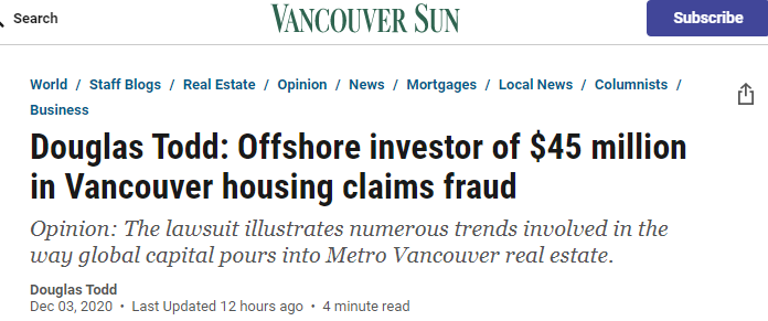 据报道,一位名叫张同(Tong Zhang,音译)的华裔地产投资商向法院提起控诉,称他先后将$4,500万加元委托给另一名华人尹航(Hang Yin,音译)在温哥华投资房产,没想到遭到了欺骗和欺诈。